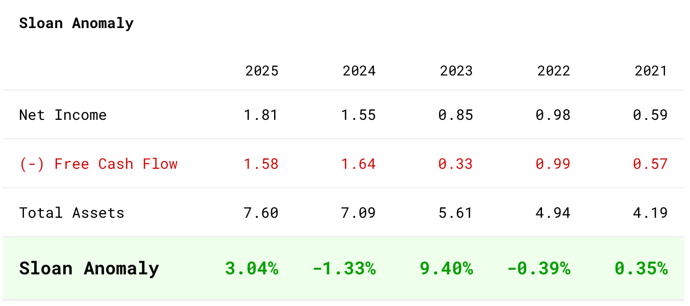 Sloan Anomaly показывает насколько чистая выручка соотносится с денежным потоком бизнеса. Если выручка большая, а потока нет - повод для беспокойства. Не надувают ли выручку искусственно.