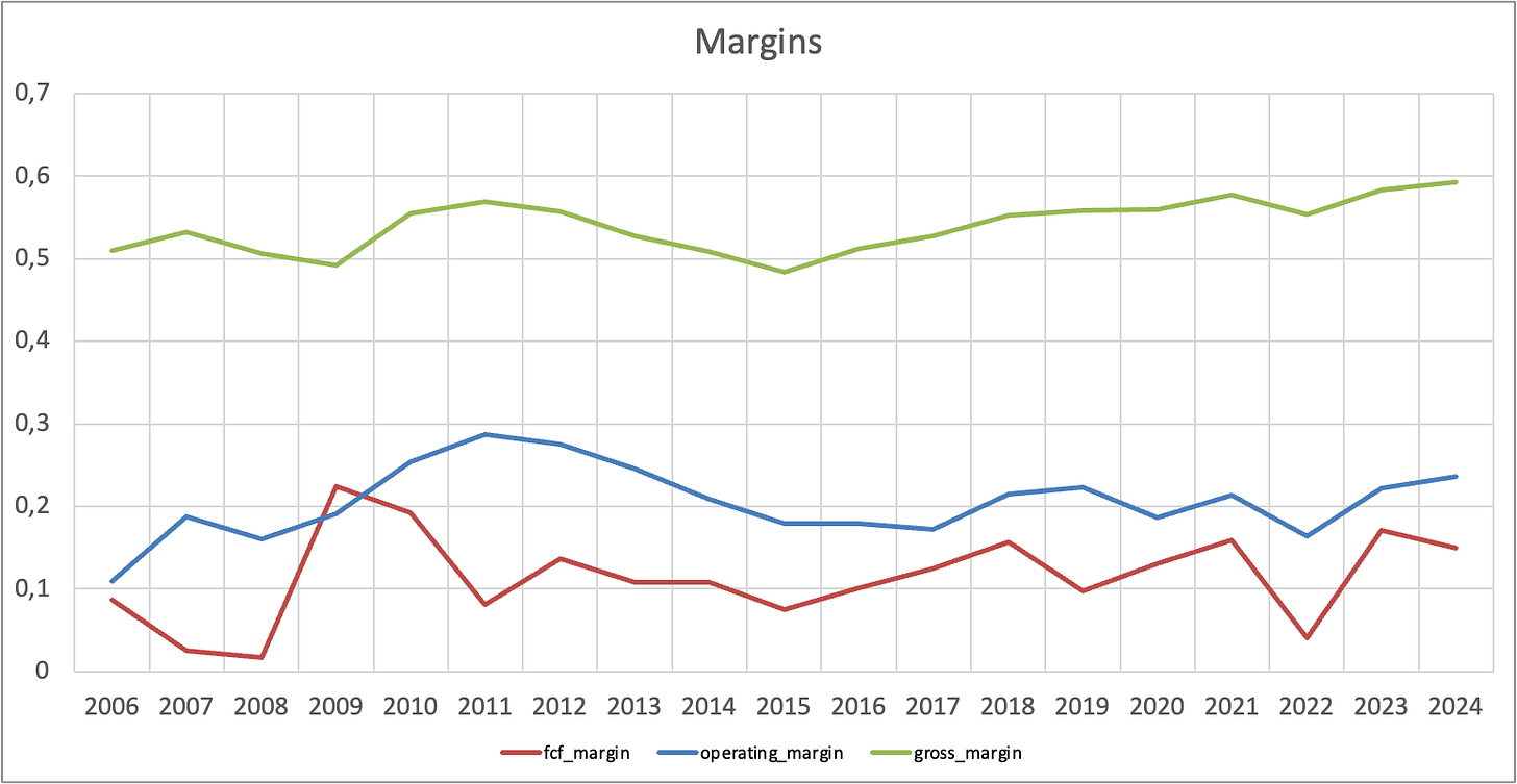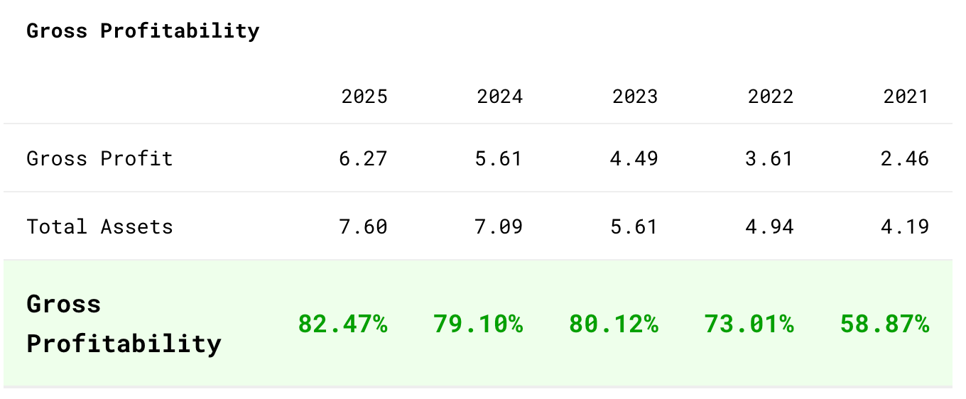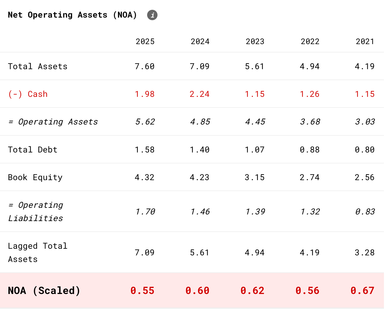 NOA довольно высок, но снижается год к году. В будущем нужно будет внимательно смотреть, сможет ли компания продолжать конвертировать свои активы в выручку, как она делает сейчас, через GP/A, потому что этот показатель у компании исключительный.