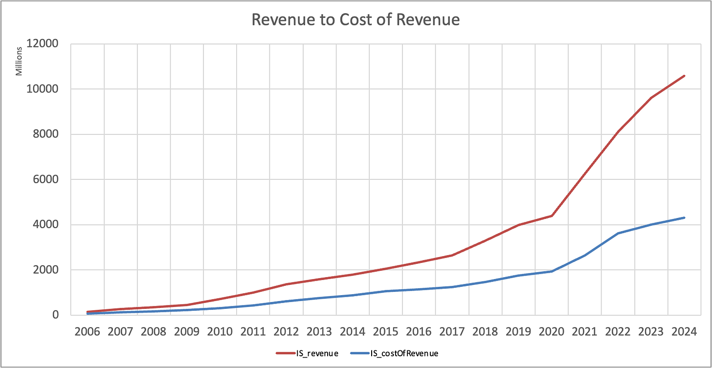 Здесь видно, почему маржа увеличивается. LULU пользуется своим премиальным положением. Выручка растет, при этом Cost of Revenue растет не так активно.