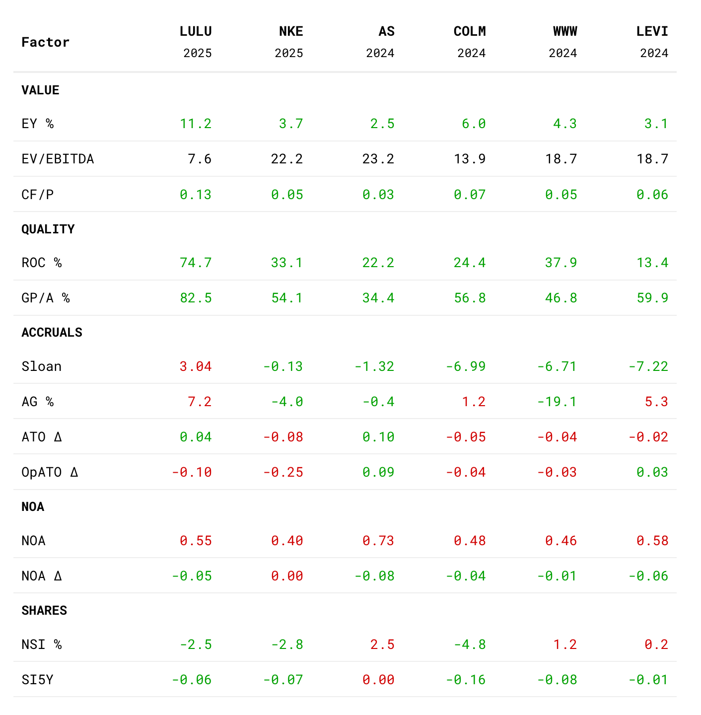 Из этого можно сделать вывод, что относительно выбранных компаний - LULU необычайно дешева.